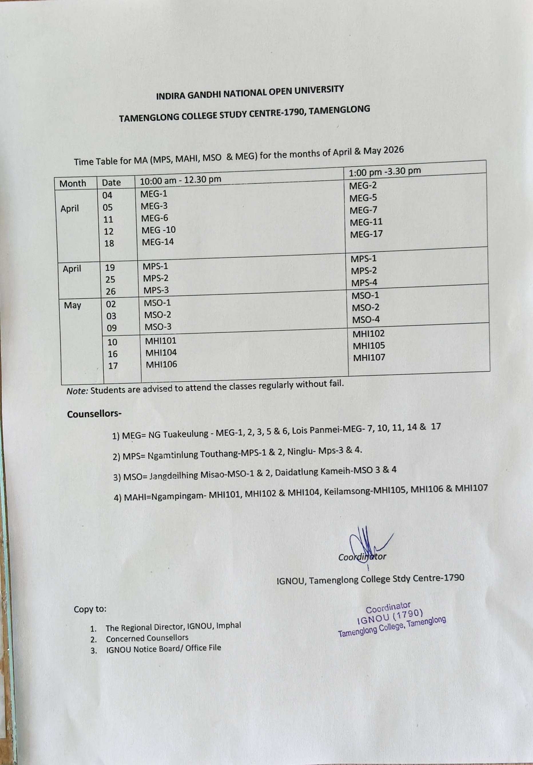 Counselling Schedule of LSC 1790 Tamenglong College for the month of April and May 2026